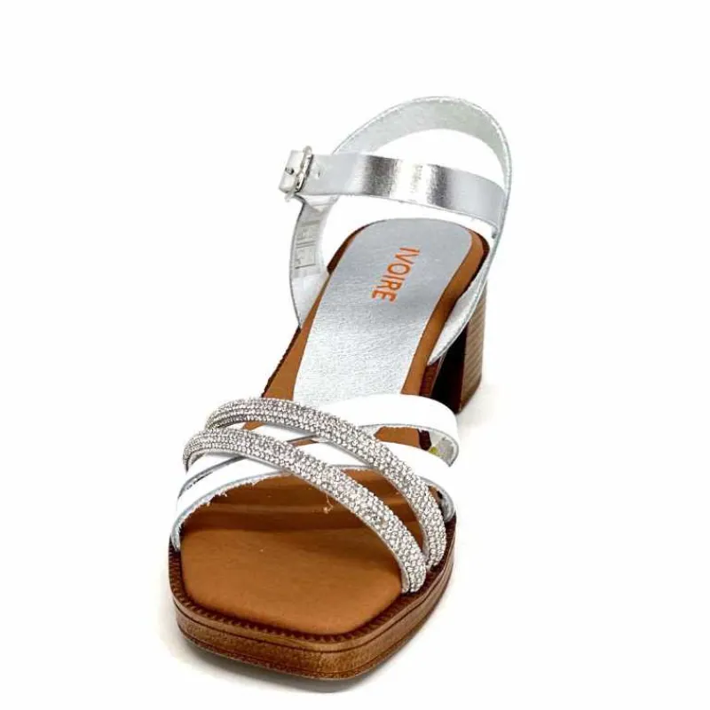 Vacances|Talon<380-ivoire Sandales à Talon Ivoire 97701-S Cuir Strass Argent Blanc